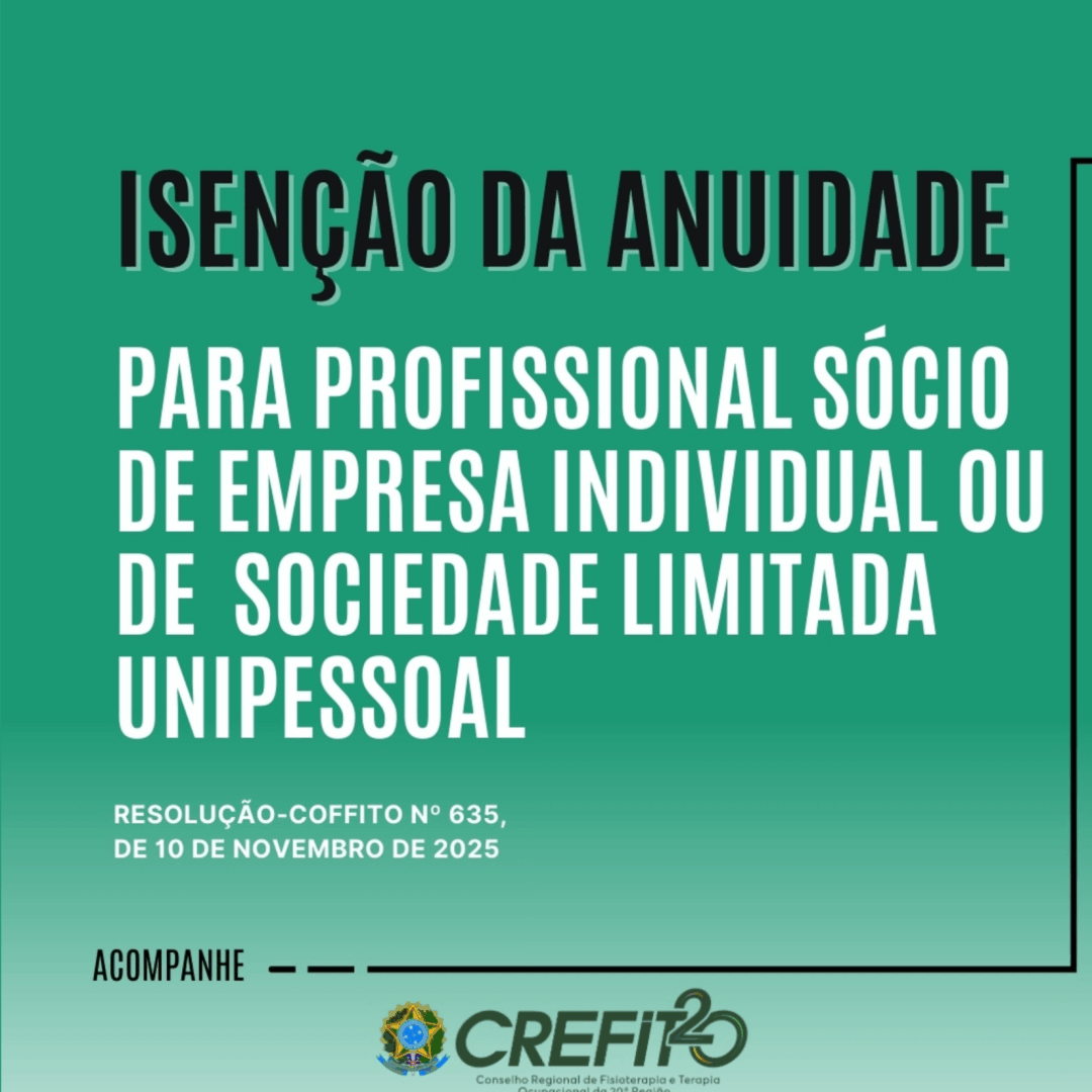 A solicitação cabível aos Fisioterapeutas e/ou Terapeutas Ocupacionais sócios de empresa de Sociedade Limitada Unipessoal (SLU) ou Empresário Individual (EI), devidamente registrados no CREFITO-20 até o prazo máximo de 31 de dezembro de 2025. A solicitação está condicionado a regularidade pecuniária de ambas as inscrições, conforme Resolução COFFITO nº 635/2025, Art. 7º, § 3º.